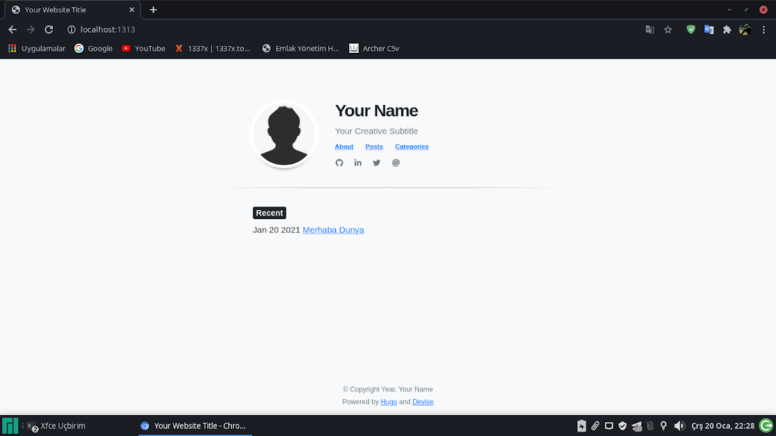 Localde sitemizi oluşturduk.İnce ayarları kendinize göre yapın bir sonraki yazıda siteyi github üzerinden yayına alma konusunu yazıcam.Şimdilik bu kadar kolay gelsin.