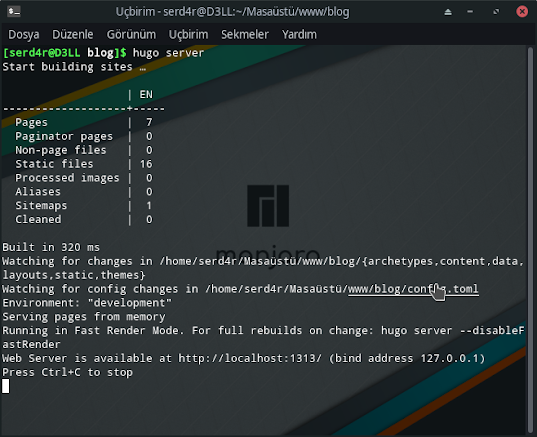 Blog klasörü içerisinde hugo server diyerek sitemizi yayına alıyoruz.