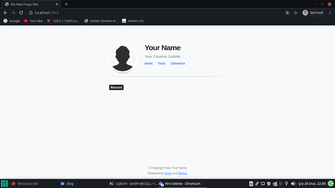 Localde sitemizi oluşturduk.İnce ayarları kendinize göre yapın bir sonraki yazıda siteyi github üzerinden yayına alma konusunu yazıcam.Şimdilik bu kadar kolay gelsin.